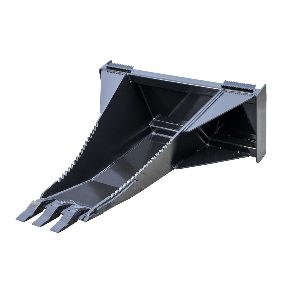 Featuring a serrated tooth design with (3) replaceable digging/excavating teeth, has two ½” x 2 wear strips welded full length on the bottom of the bucket, this powerful digging attachment is fabricated from commercial-grade 1/2″ steel with double gusset sidewall construction. If you want a digger that was built to last, this unit is a great option no matter what type of loader you’re working with. Request a quote today.